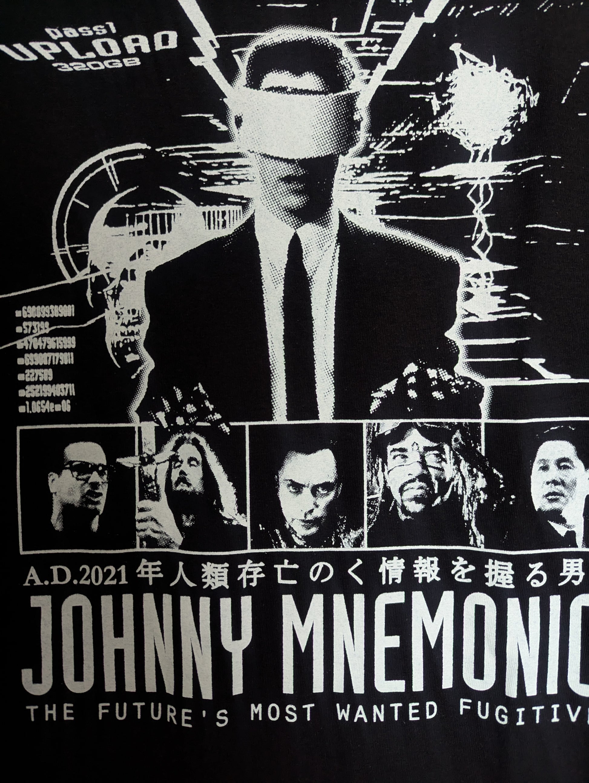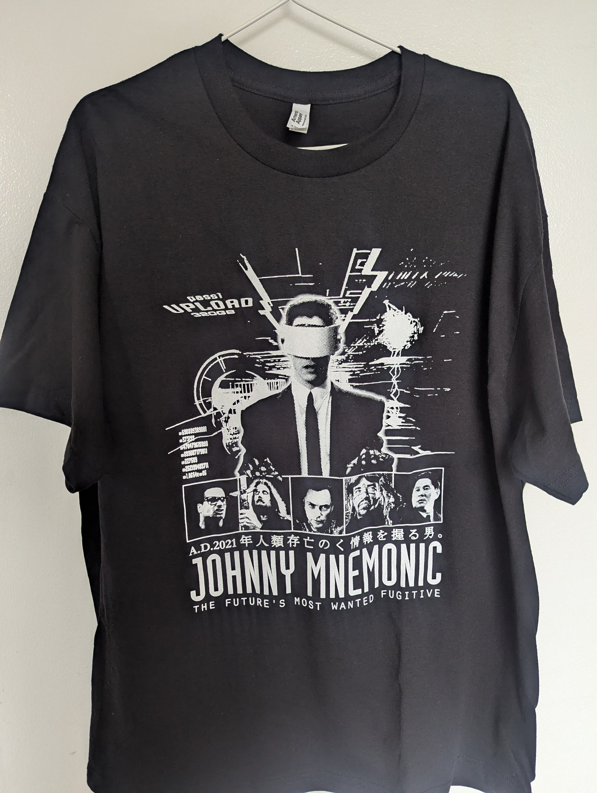 Johnnie Mnemonic 1 color 2 location design screen-printed on an American Apparel 1301 heavy weight cotton t-shirt.