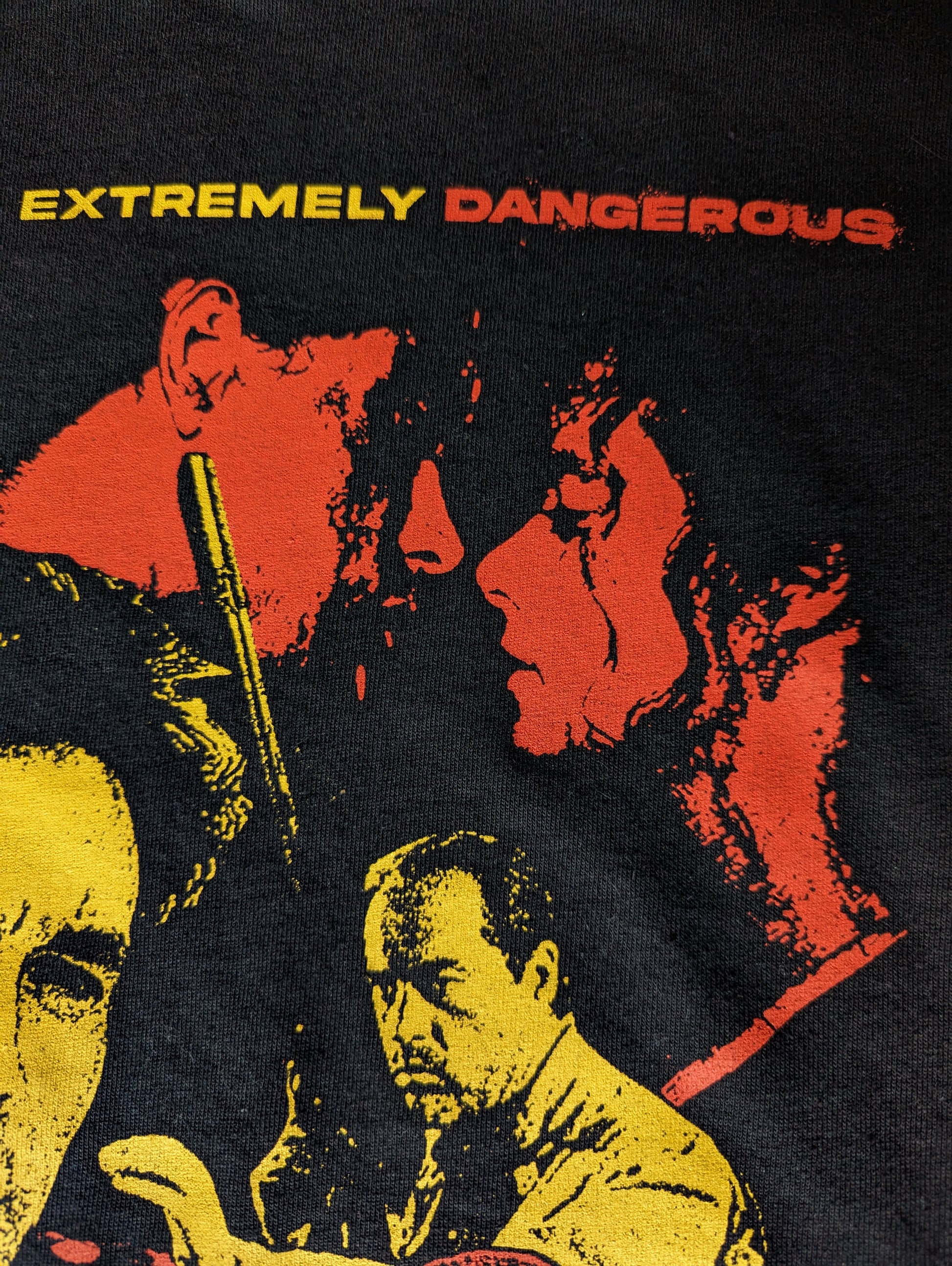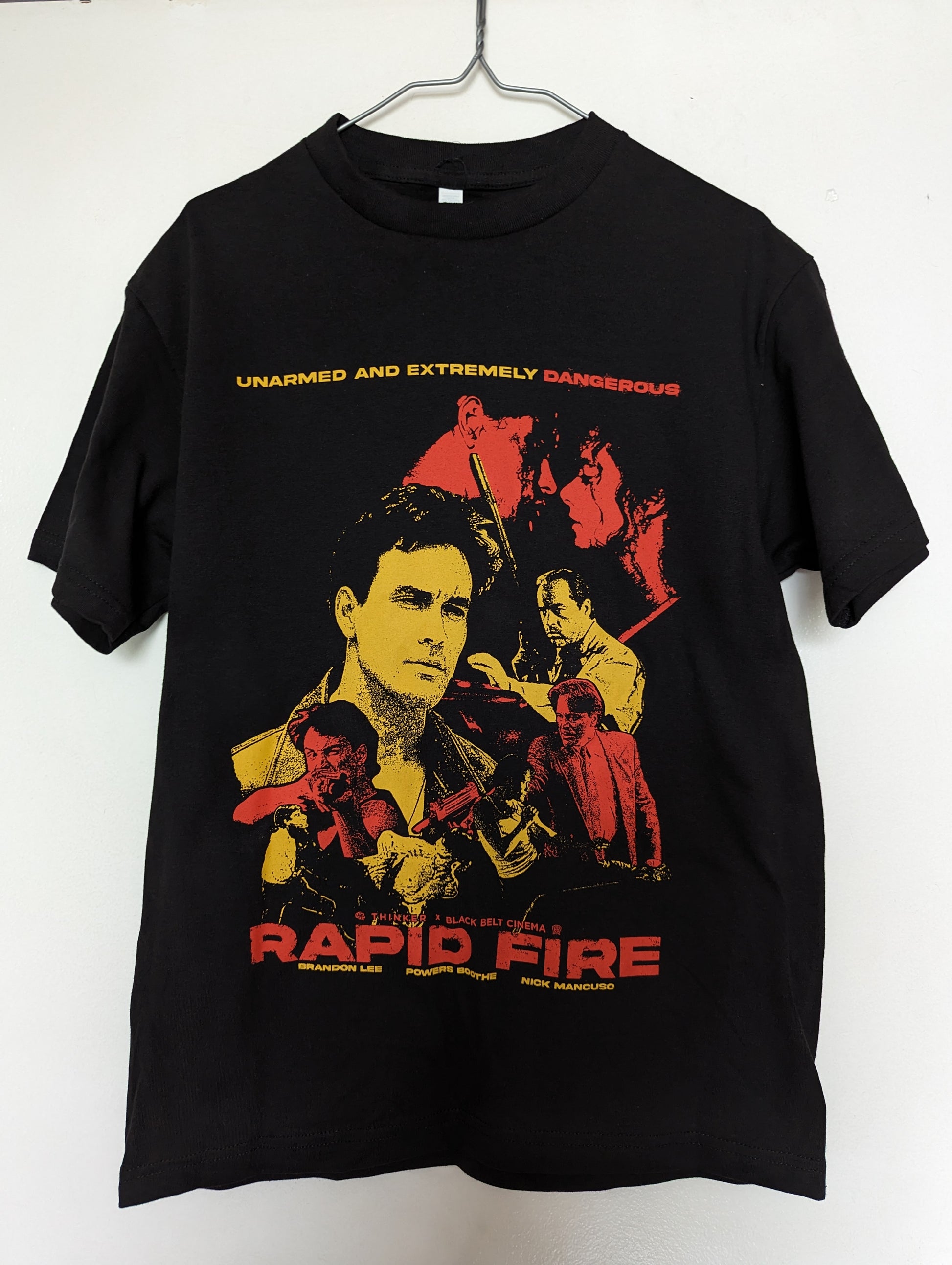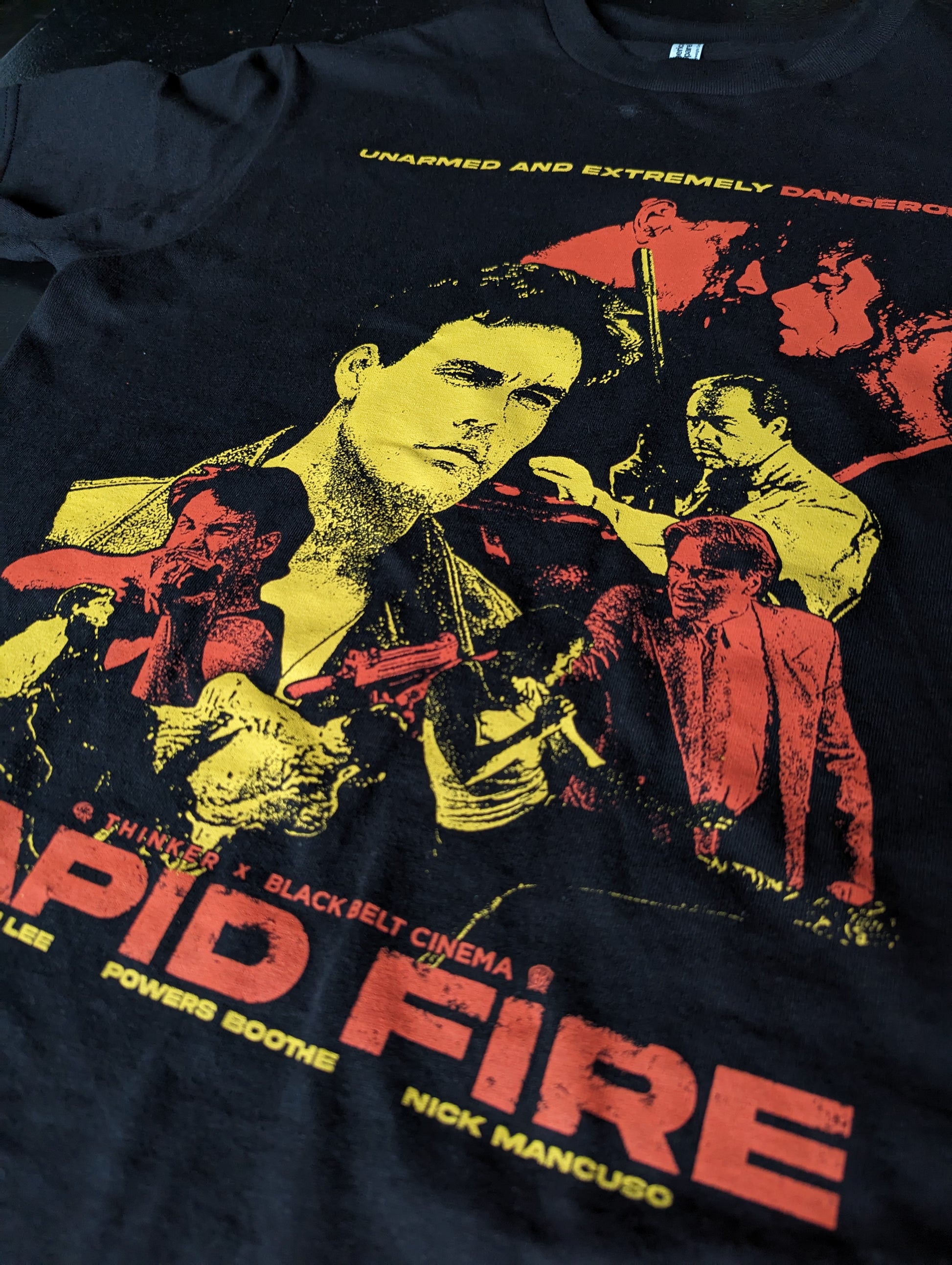 Rapid Fire design 2 color screen-print on a black American Apparel 1301 t-shirt.